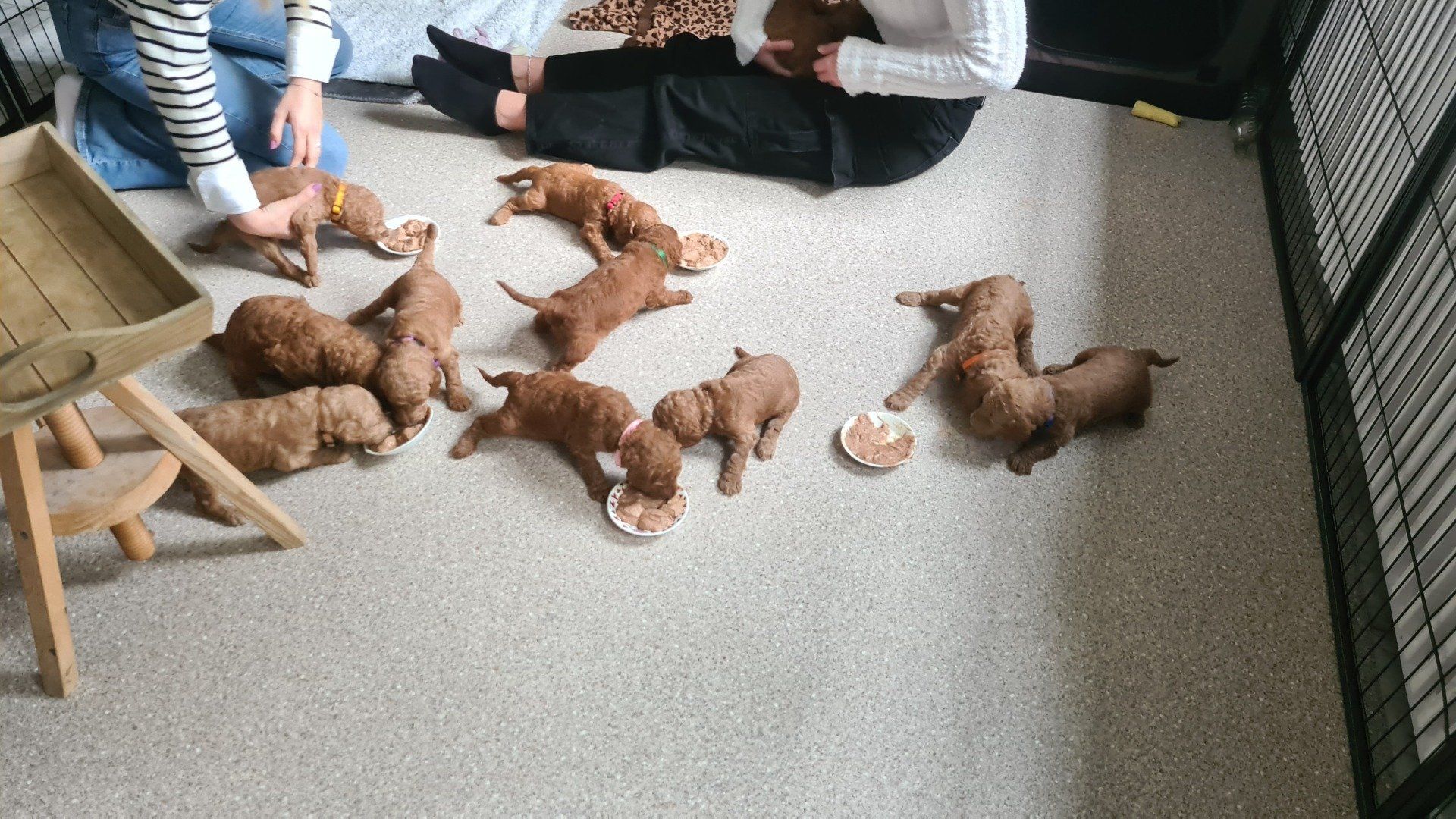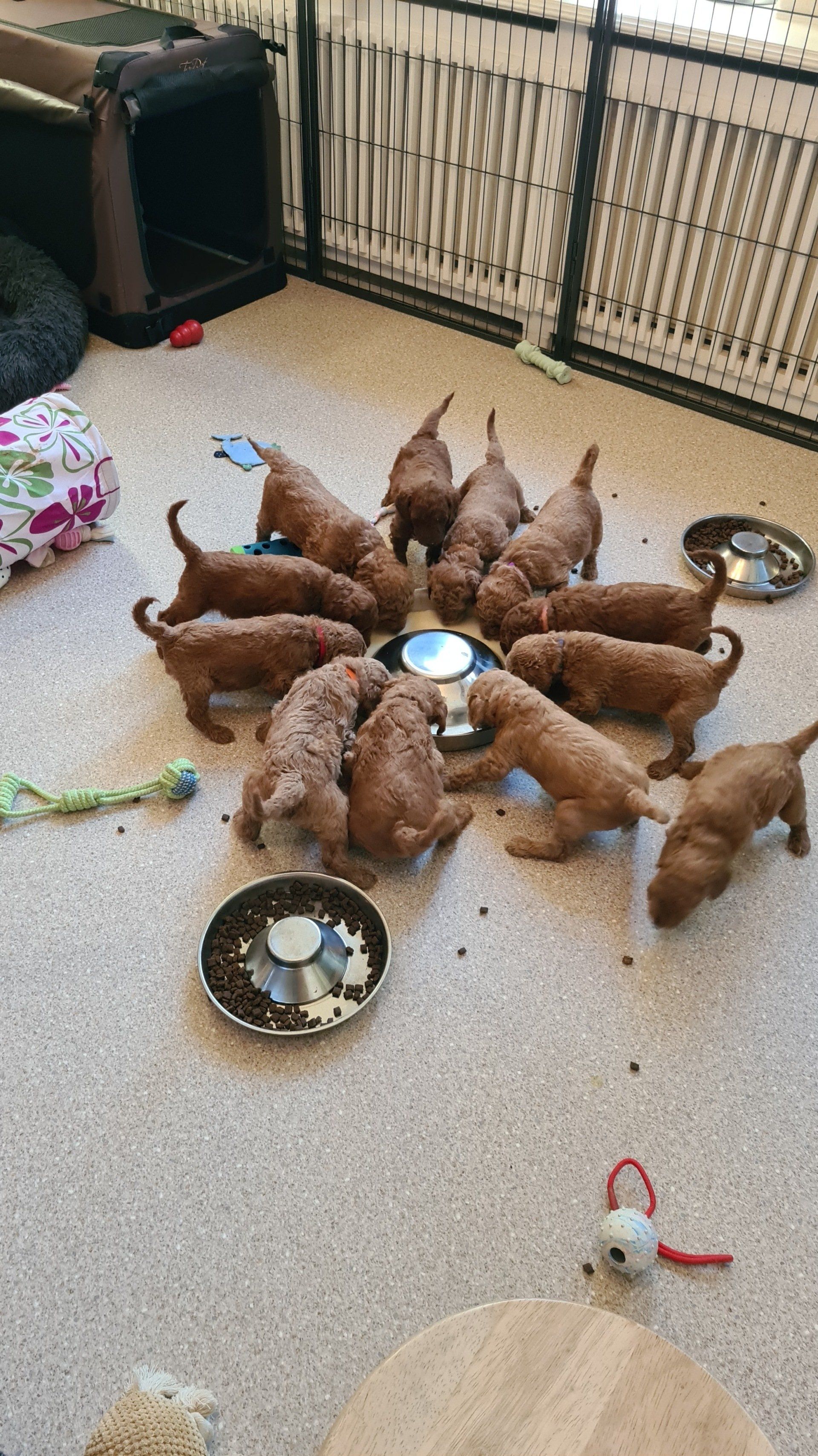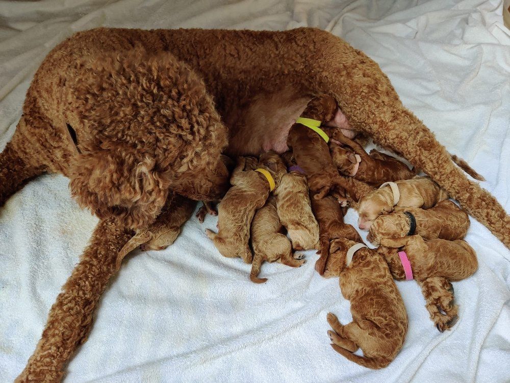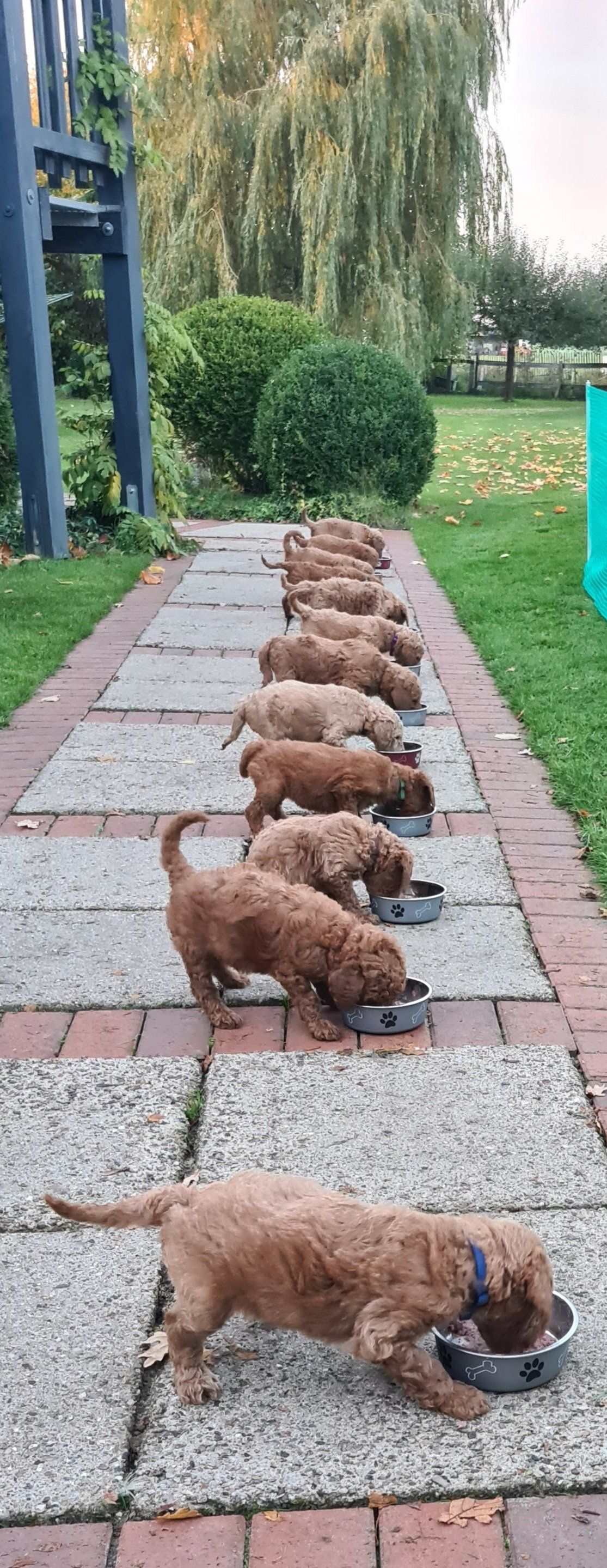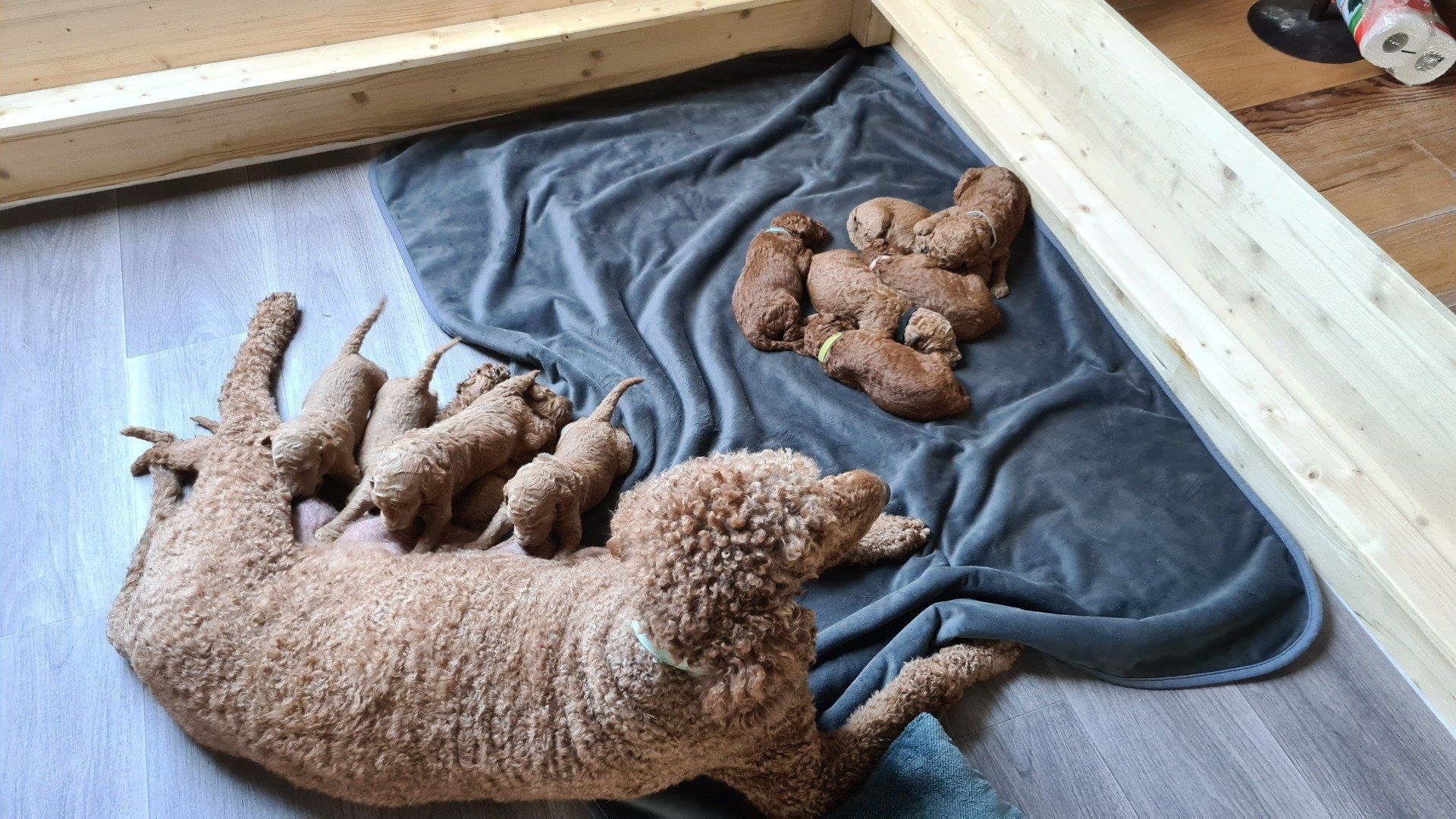 Insgesamt sind es 12 Welpen: 9 Mädchen und 3 Jungs (Dunkelblau / Braun / Grau), und Frida kümmert sich super um die Kleinen.