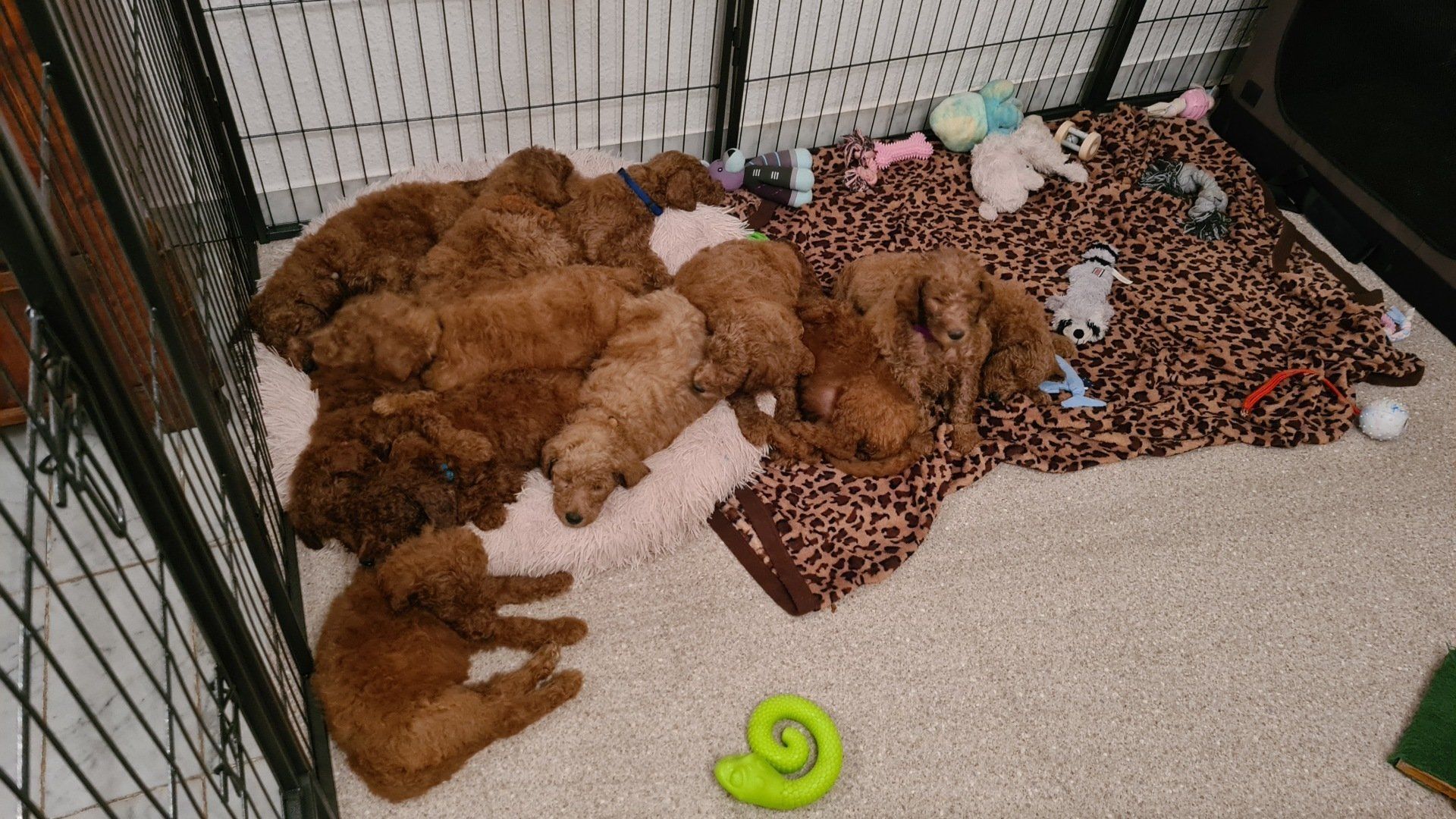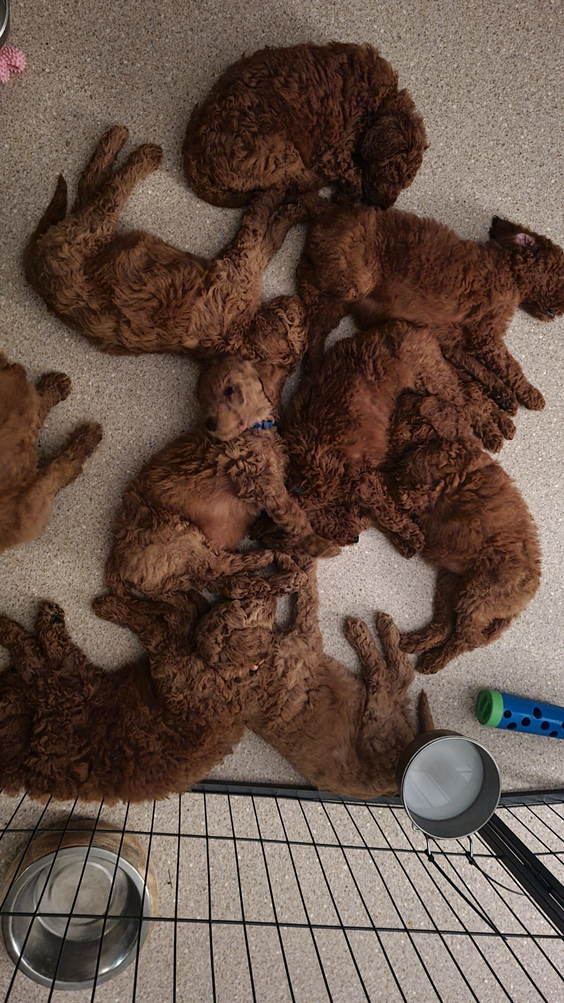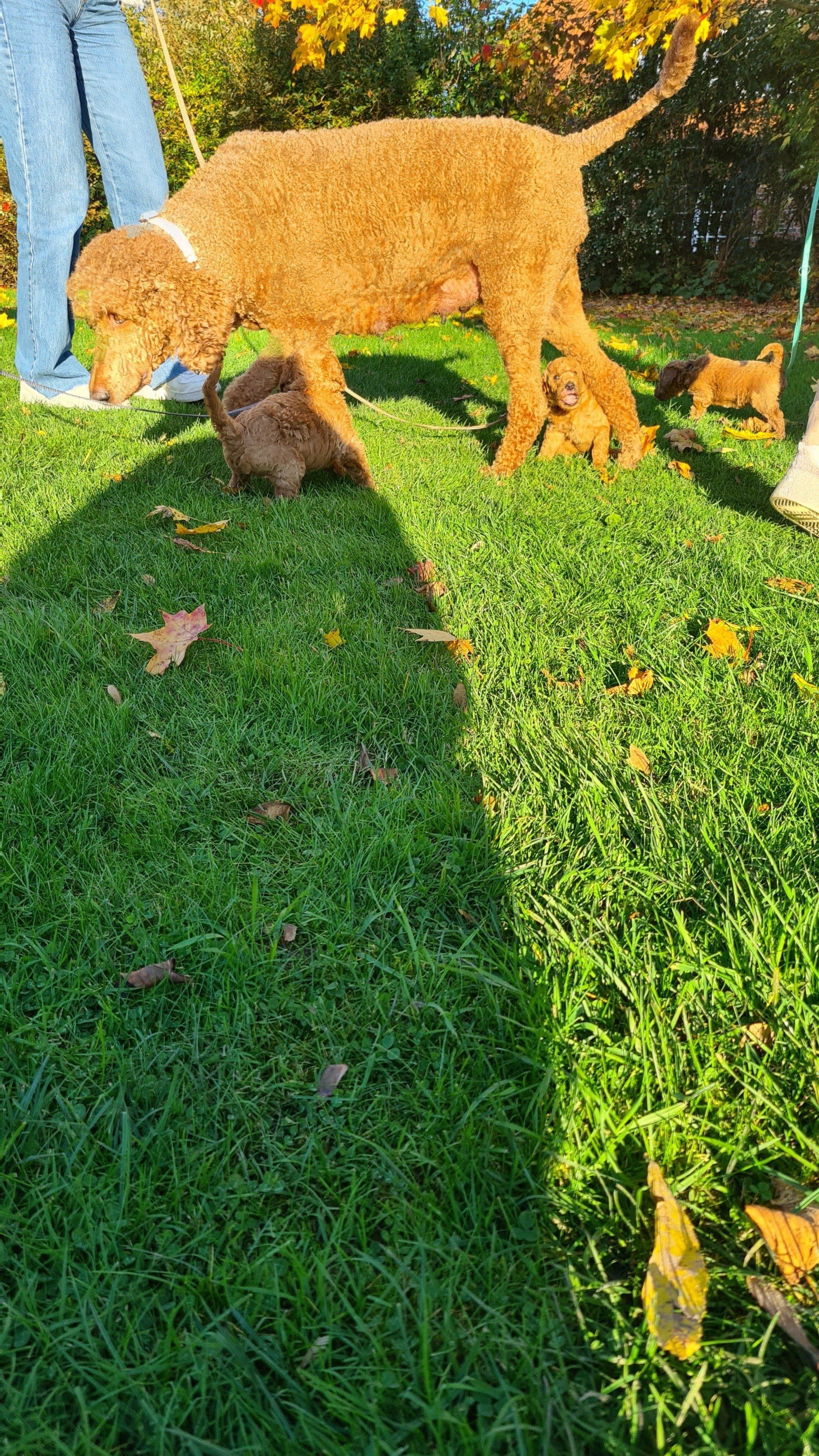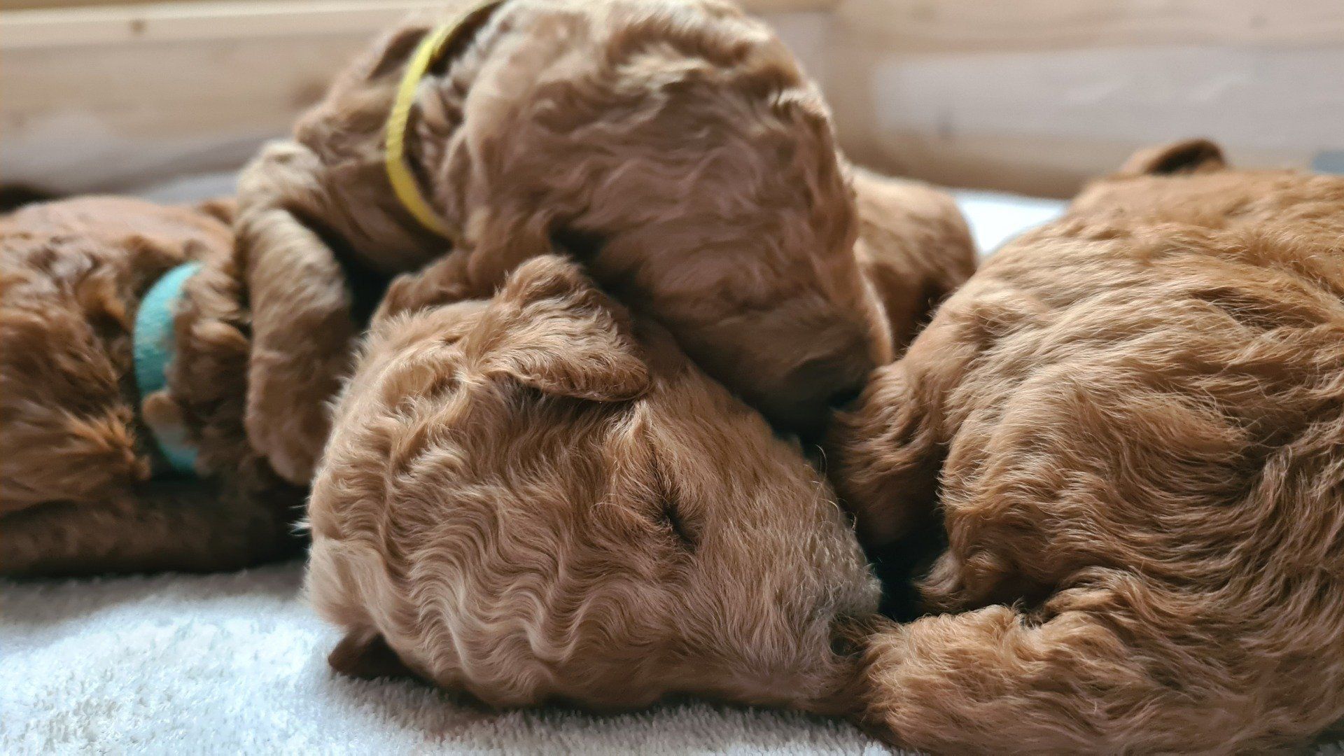 Insgesamt sind es 12 Welpen: 9 Mädchen und 3 Jungs (Dunkelblau / Braun / Grau), und Frida kümmert sich super um die Kleinen.